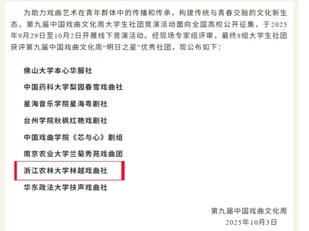 近日,第九届中国戏曲文化周在北京园博园落幕。在本届文化周高校社团竞演中,浙江农林大学林越戏曲社凭借越剧《陈三两・骂堂》一折,从25 支入围社团中突围,斩获 “明日之星” 优秀社团荣誉,指导老师周迎萍获“优秀指导老师”称号。