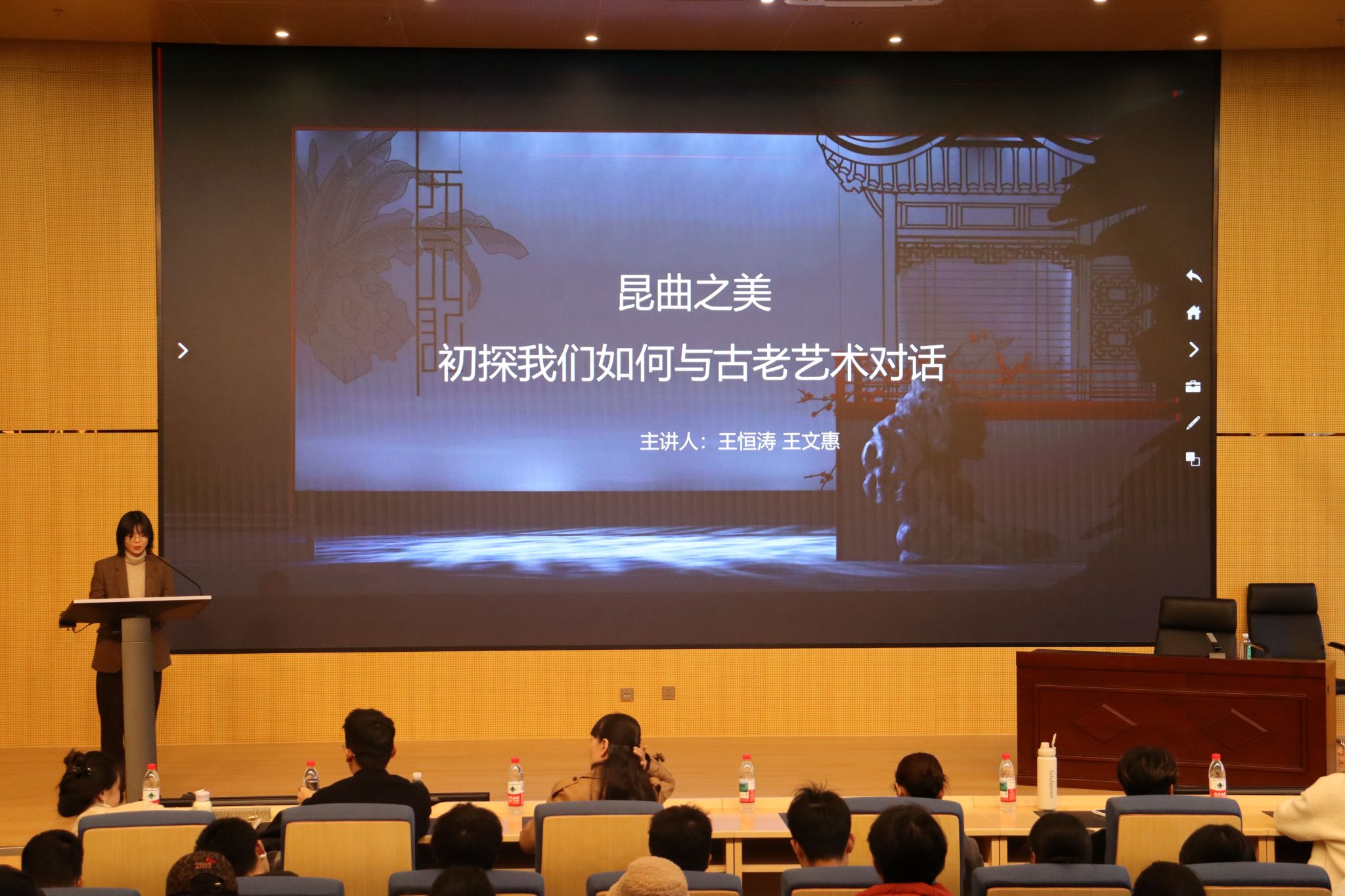 2025年11月20日晚,我校新新农科交叉报告厅内丝竹悠扬,曲韵婉转。应我校团委邀请,浙江昆剧团优秀青年演员王恒涛、王文惠莅临我校,为师生们带来了一场题为《昆曲之美——探讨我们如何与古老艺术对话》的精彩讲座与艺术示范。活动现场座无虚席,一场跨越六百年的艺术对话在此温情上演。