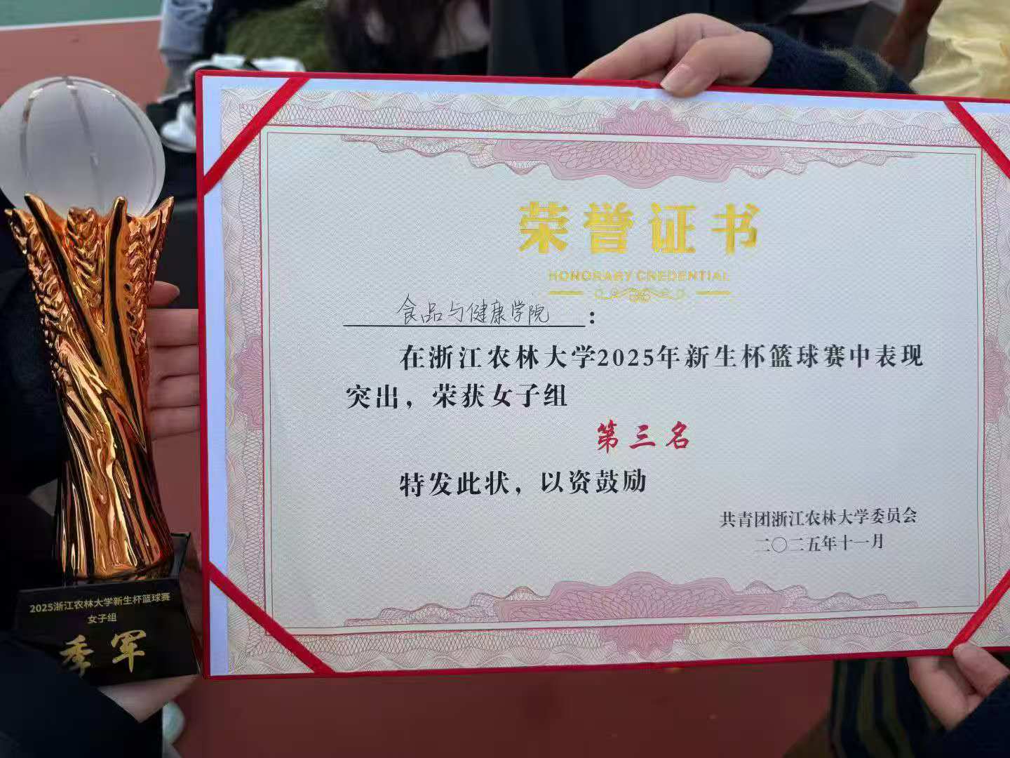 近日,学校新生杯篮球赛圆满落幕。食健女篮代表队在赛场上奋勇拼搏、默契配合,成功斩获新生杯篮球赛季军,用汗水与实力书写了食健学子的体育风采。