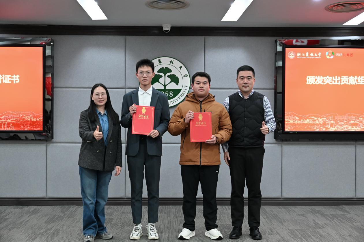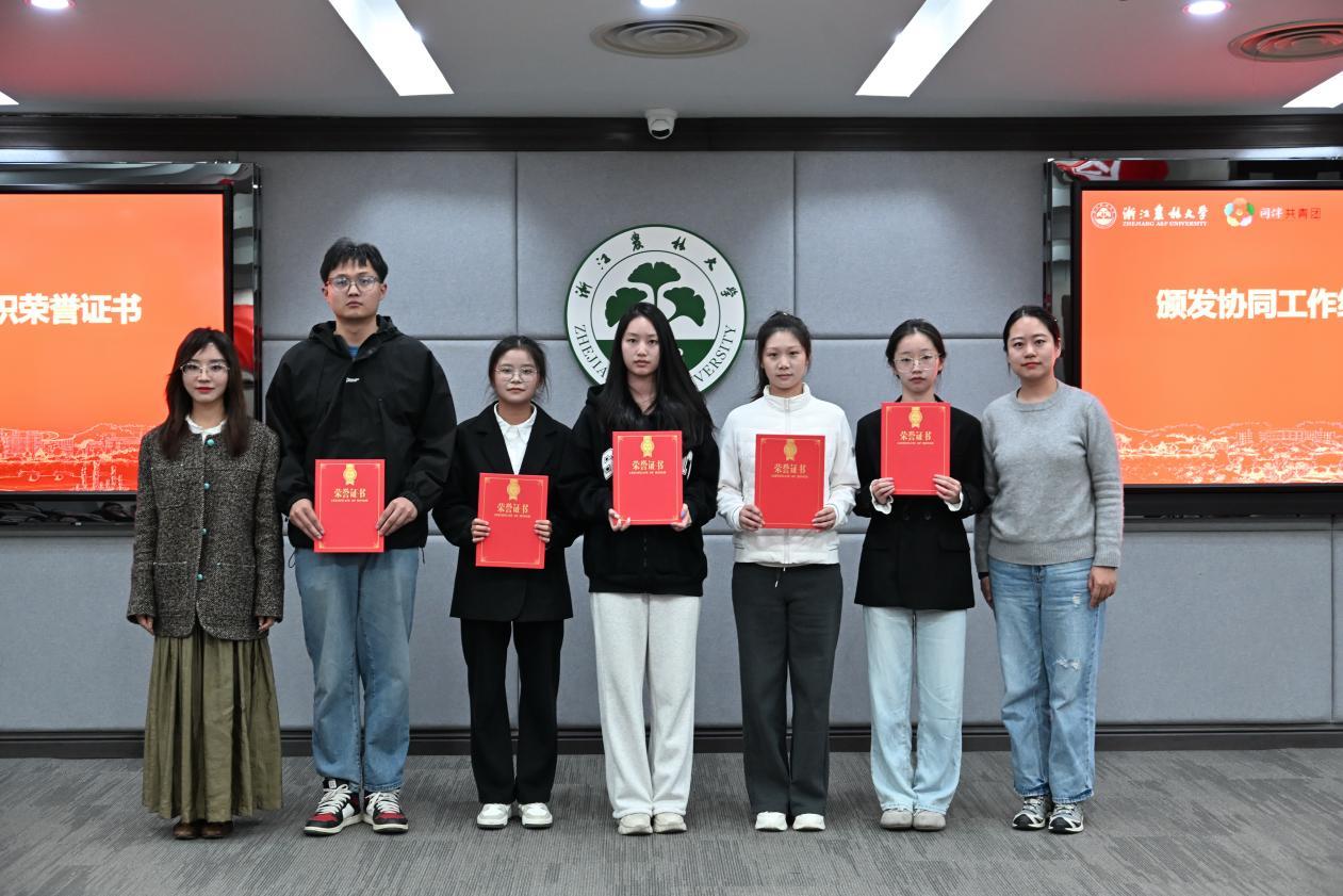 经评选,校研究生会、大学生综合服务中心、大学生志愿实践委员会、大学生社团管理委员会、大学生第二课堂服务中心荣获协同工作组织;大学生基层团建指导中心、浙农林青年融媒体中心、校大学生艺术团被授予优秀学生组织称号;校学生会、大学生科技创新中心获评突出贡献组织。与会领导老师为获奖集体颁发荣誉证书并合影留念。