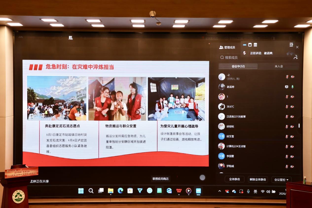 会上,胡佳铭、周永鑫、谢孟婷3位往届优秀西部计划志愿者通过线上形式依次分享服务经历。他们扎根西部,在乡村振兴、乡村教育、团员教育发展、办公室等岗位上履职尽责、倾情奉献,用亲身经历讲述西部基层的工作日常、成长收获与感动瞬间,生动展现了浙农林青年“用一年不长的时间,做一件终生难忘的事”的责任担当,激励在场学子心怀家国、勇担使命。