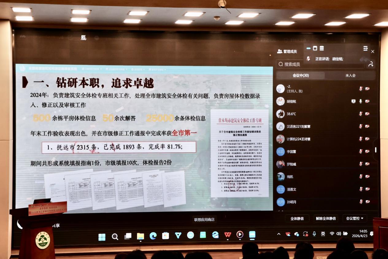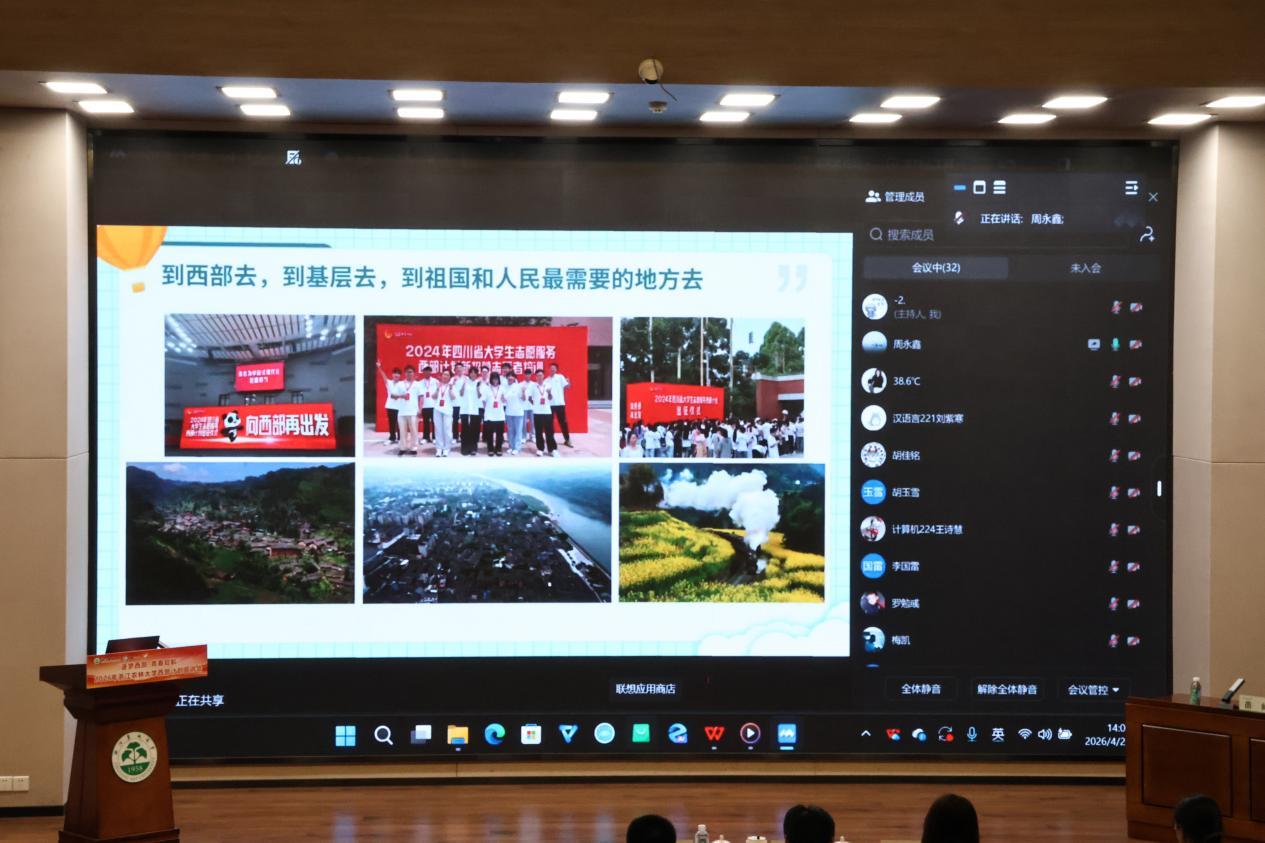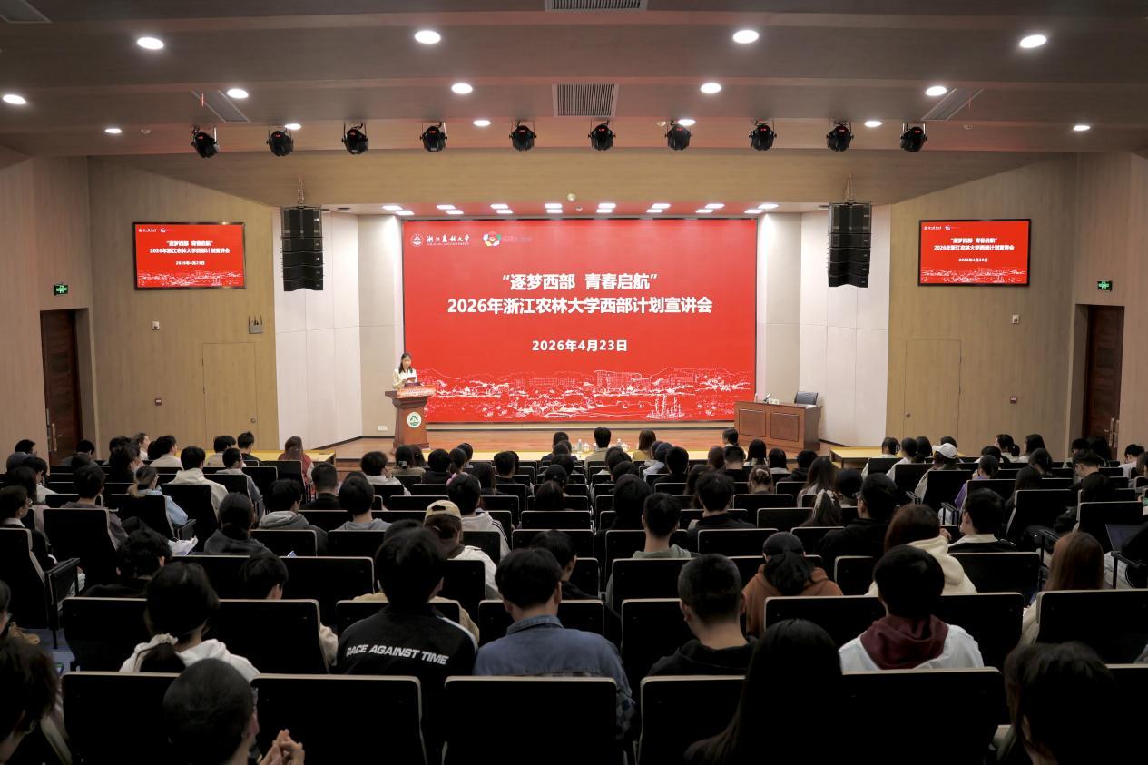为深入学习贯彻习近平总书记给新疆谢衣特小学戍边支教西部计划志愿者服务队的回信精神,引导广大青年学子响应国家号召、奔赴基层一线,4月23日,浙江农林大学 2026年西部计划专场宣讲会举行。校团委副书记郑凌峰、浙江省项目办苗帅老师出席活动,我校往届优秀西部计划志愿者代表及 300 余名有志服务西部的本研学生代表通过线上线下相结合的方式参加宣讲会。