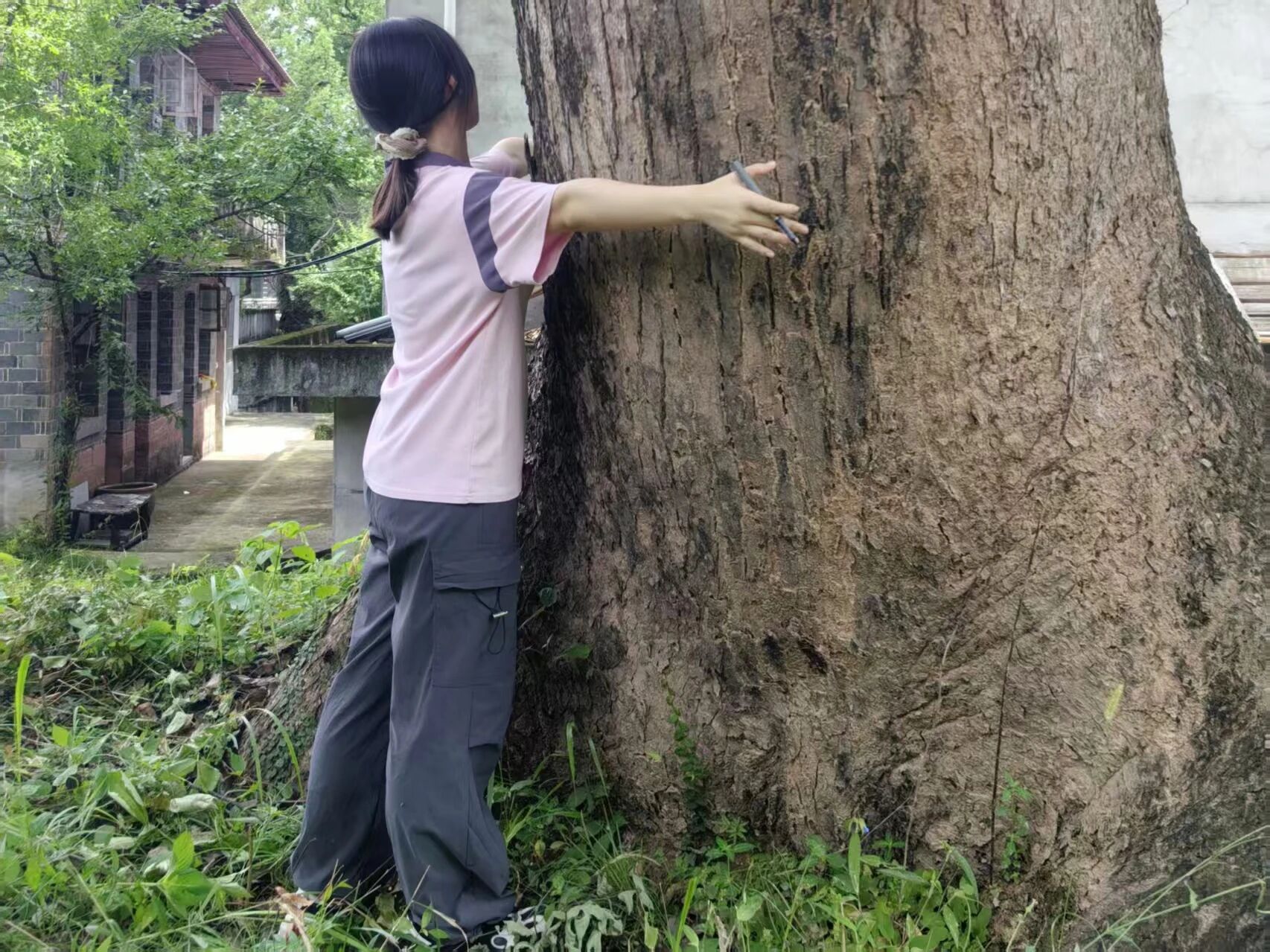 这棵樟树与村落相伴数百年,承载着悠长的乡村记忆。树高约四层房屋,树冠遮天蔽日,枝桠虬曲伸展,树干粗壮无比,树皮厚实而斑驳。在村委会负责人的讲解下,实践团了解了古樟树的信息,并与这位“百岁老人”进行了亲密接触,轻抚其饱经风霜的纹理,张开双臂拥抱粗壮的树干,并用镜头细致记录下古树的每一处风貌。