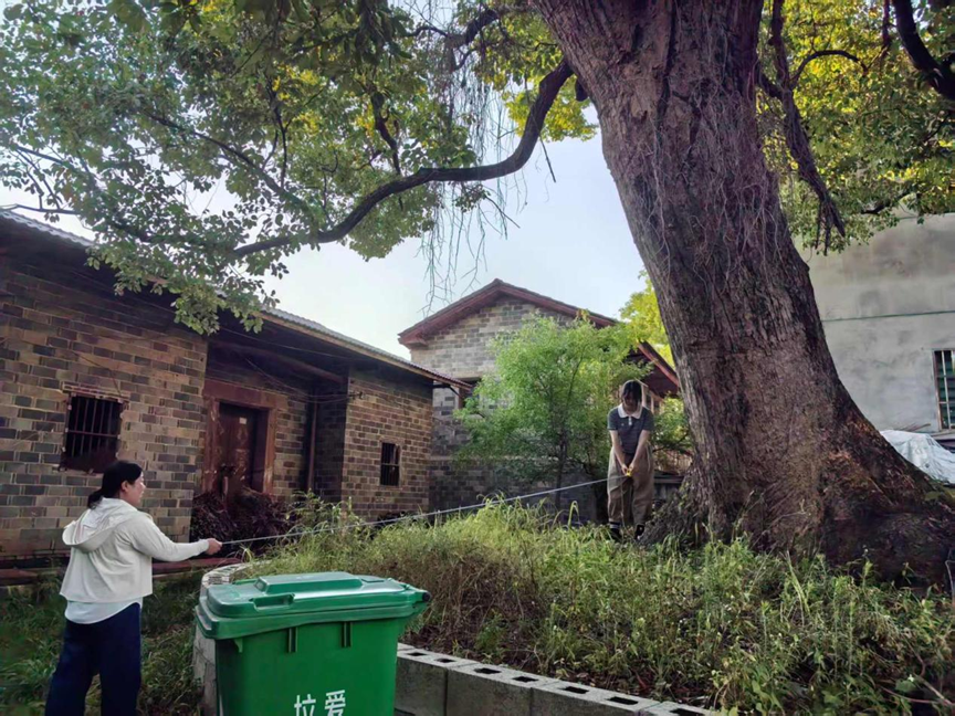实践团首先对百年古樟进行了测量并作了数据记录。成员们选取与树冠顶部齐平的观测点,以了解村庄的全貌并估测树度。随后,成员们又对古树进行树冠直径和主干直径的测量。初步测量数据显示:树高约12米,树冠直径约20米,主干直径约1.3米。
