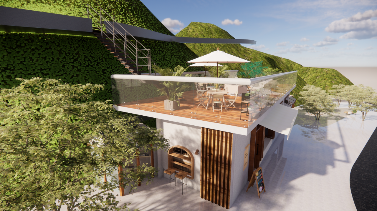 基于前期调研成果,实践团从宏观联动自然和微观内部转化两方面系统性改造垃圾房,以创意工作室的方式进行规划设计。建筑首层规划为开放式工作室,配备直播设备,可供村民开展线上营销;首层延伸的拓展空间设计为多功能展示厅,既可展示当地竹艺手工艺品,又能作为农产品展销窗口;顶层打造全景观景平台,通过竹质楼梯与村道自然衔接,打造网红打卡点。通过精心设计,充分利用建筑的地理优势,既保留了建筑历史记忆,又赋予其新的时代功能,将其打造成为连接外来游客与村庄内部的重要媒介。