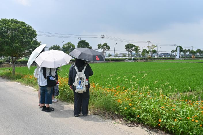再次回到这片沃土,稻田已褪去最初的稚嫩,青绿色的稻叶茁壮成长,风过处掀起层层碧浪。团队从稻田观光区出发,沿着笔直的机耕路缓步前行。道路两侧皆是碧绿,偶有白鹭掠过田间,与不远处的农舍相映成趣。成员们手持相机,记录途中的每一处细节,也发现了场地中存在的不少问题。“这条道路常有车辆通行,却没有设置人行道,游客行走其中存在安全隐患。”赵艺然回忆道,“沿途也没有设置休憩场地,纯粹的徒步消耗体力又缺乏乐趣。”团队成员分工协作,有的记录路面宽度与破损程度,有的标注路旁种植的植被种类,有的则用手机将场地照片在卫星地图上一一定位,调研工作有条不紊地进行。
