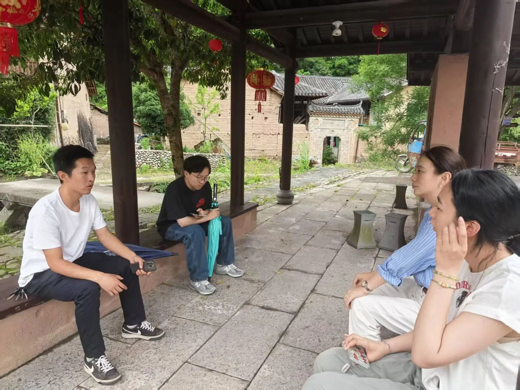 下午,团队一行前往九龙乡王湾村、杨绿湖村,实地考察该村已建成的电商直播民宿项目,并与村内电商直播团队面对面交流,详细了解直播运营流程、空间配置需求以及相关配套设施现状。通过实景拍摄与访谈记录,实践团队系统性梳理了“农文旅融合”新业态下的空间功能需求,为后续设计介入提供了数据支撑与场景依据。