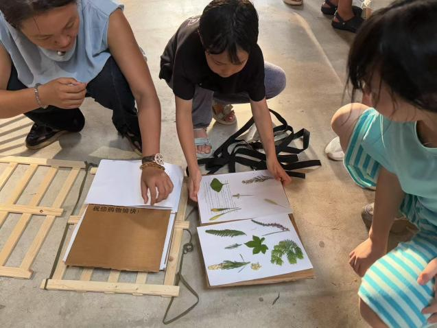 下午的课程构建“理论-采集-创作”三级体系,团队成员向儿童解析植物分类学基础及昆虫鸟类纲目特征,通过图文对照强化认知。随后在成员全程监护下,儿童运用专业工具收集植物样本,规范操作捕虫网观察蜻蜓、蝴蝶等昆虫特征。