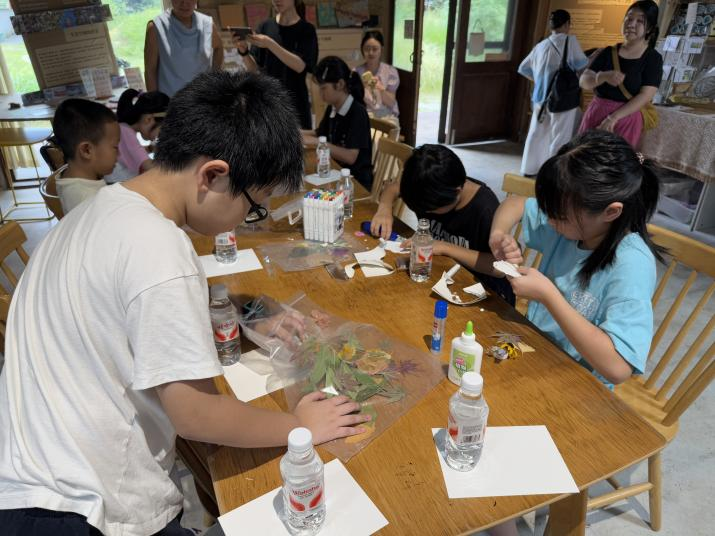 晚间自然艺术创作课堂充满童趣氛围。孩子们用木槌敲打叶片与花瓣,将植物拓印在扇面和手帕上,观察植物的独特纹理;充满想象力的作品在欢声笑语中诞生,自然知识完成了从课堂到生活的转化,成为次日公益市集的特色展品,印证了体验式教学的科学有效性。