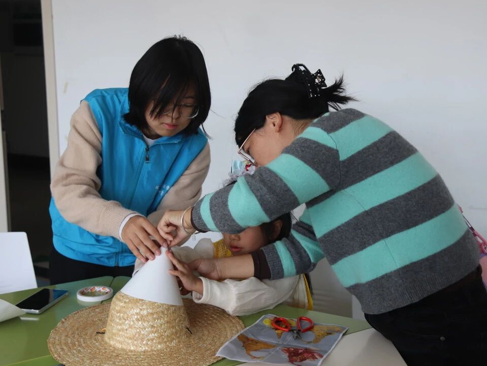 捡拾满篮的秋日馈赠后,大家回到了温暖的室内课堂,一场创意风暴正式上演。在这里,形态各异、色彩斑斓的落叶瞬间变成了神奇的“魔法道具”。在志愿者们的协助和鼓励下,孩子们发挥天马行空的想象力,将一片片银杏、枫叶、梧桐叶精心粘贴在帽檐上。有的帽子像戴上了一顶金色的王冠,有的则缀满了红黄相间的斑斓图案,每一顶都是独一无二的艺术品。活动现场暖意融融,孩子们的笑脸与手中的“魔法帽”相映成趣,定格成这个秋天最动人的画面。