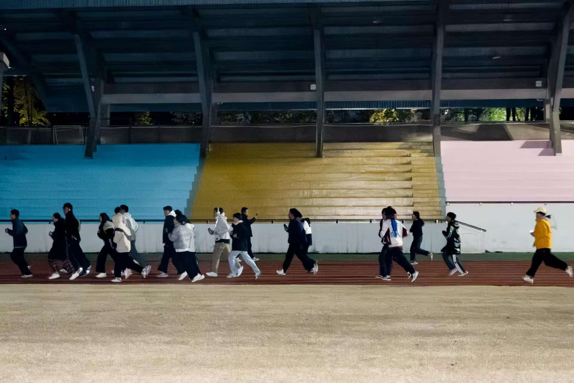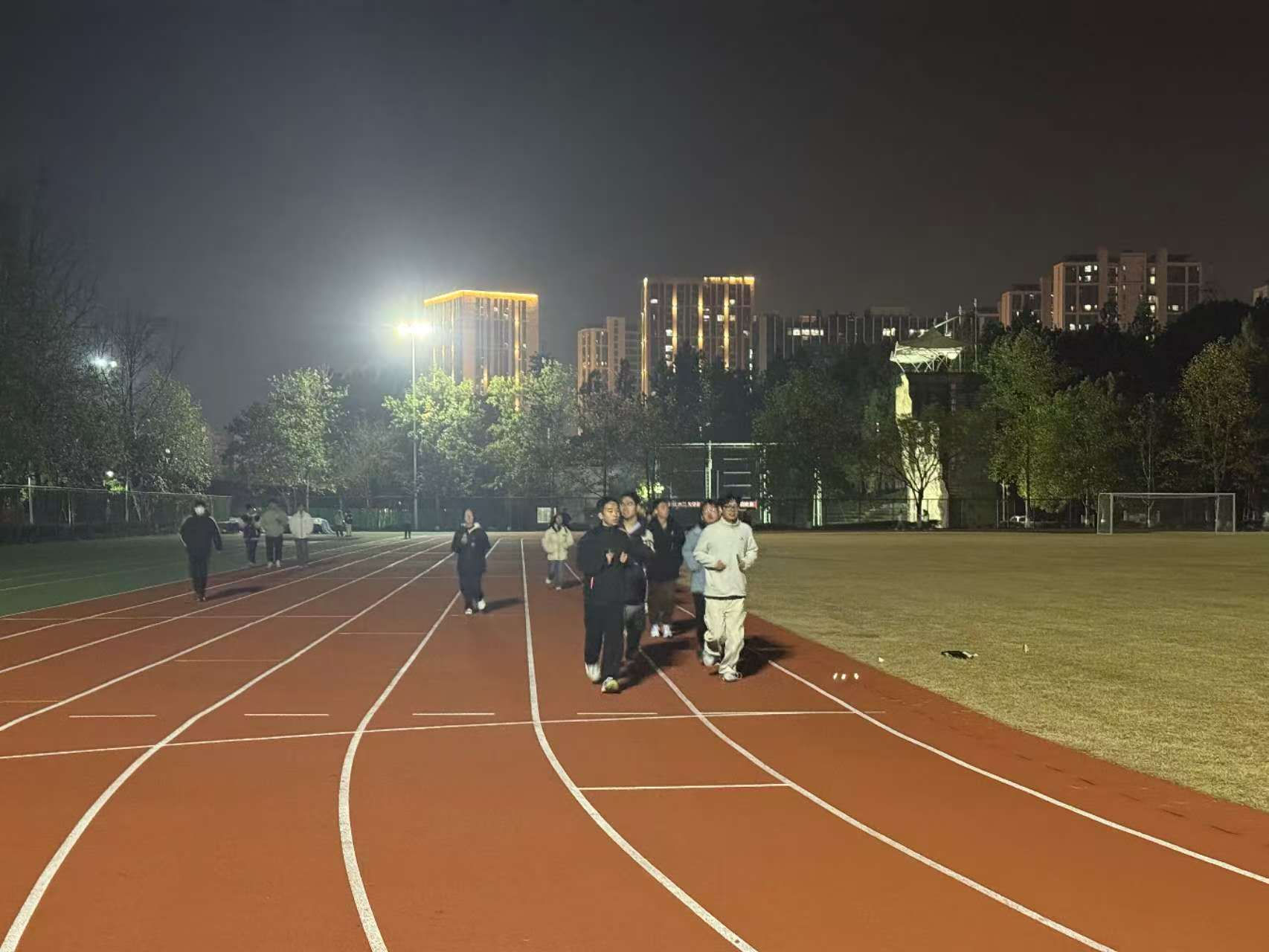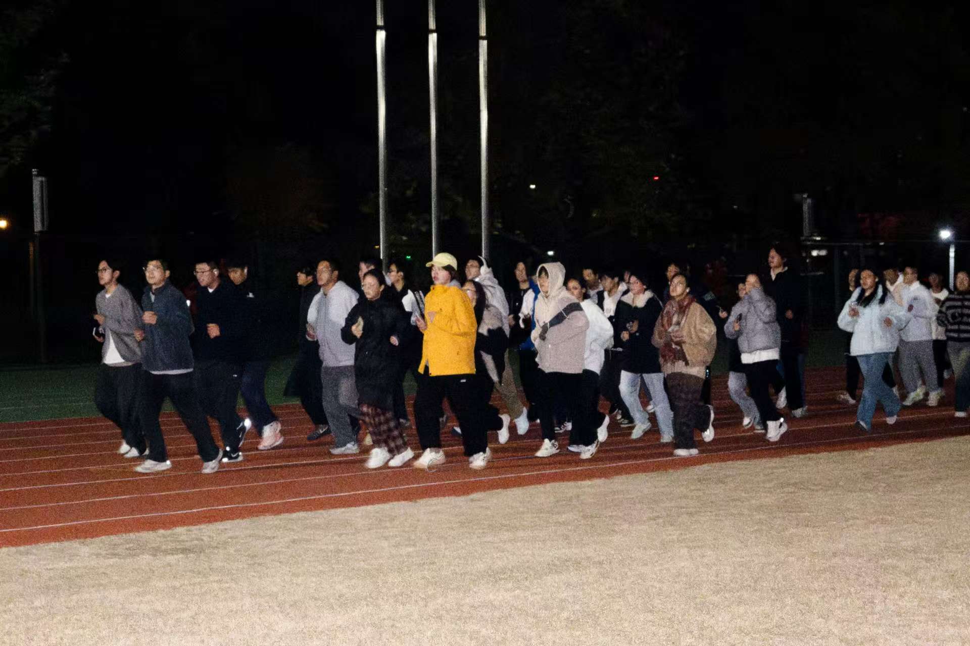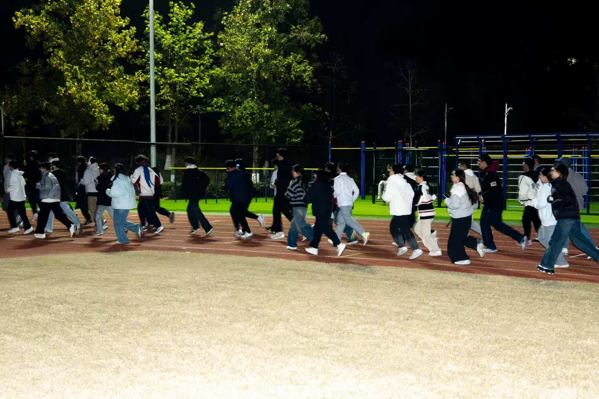 热身结束后,2公里限速跑正式展开。同学们展现出饱满的热情与昂扬的姿态,有人结伴而行、互相鼓励,也有人保持自己的节奏、稳步向前。晚风轻拂,跑道上人影跃动,无论是领跑的老师们不时调整速度等候体力不支的同学,还是同学们遇到困难时彼此伸出的援手,都让这场夜跑超越了运动本身,充满着温暖与集体的力量。